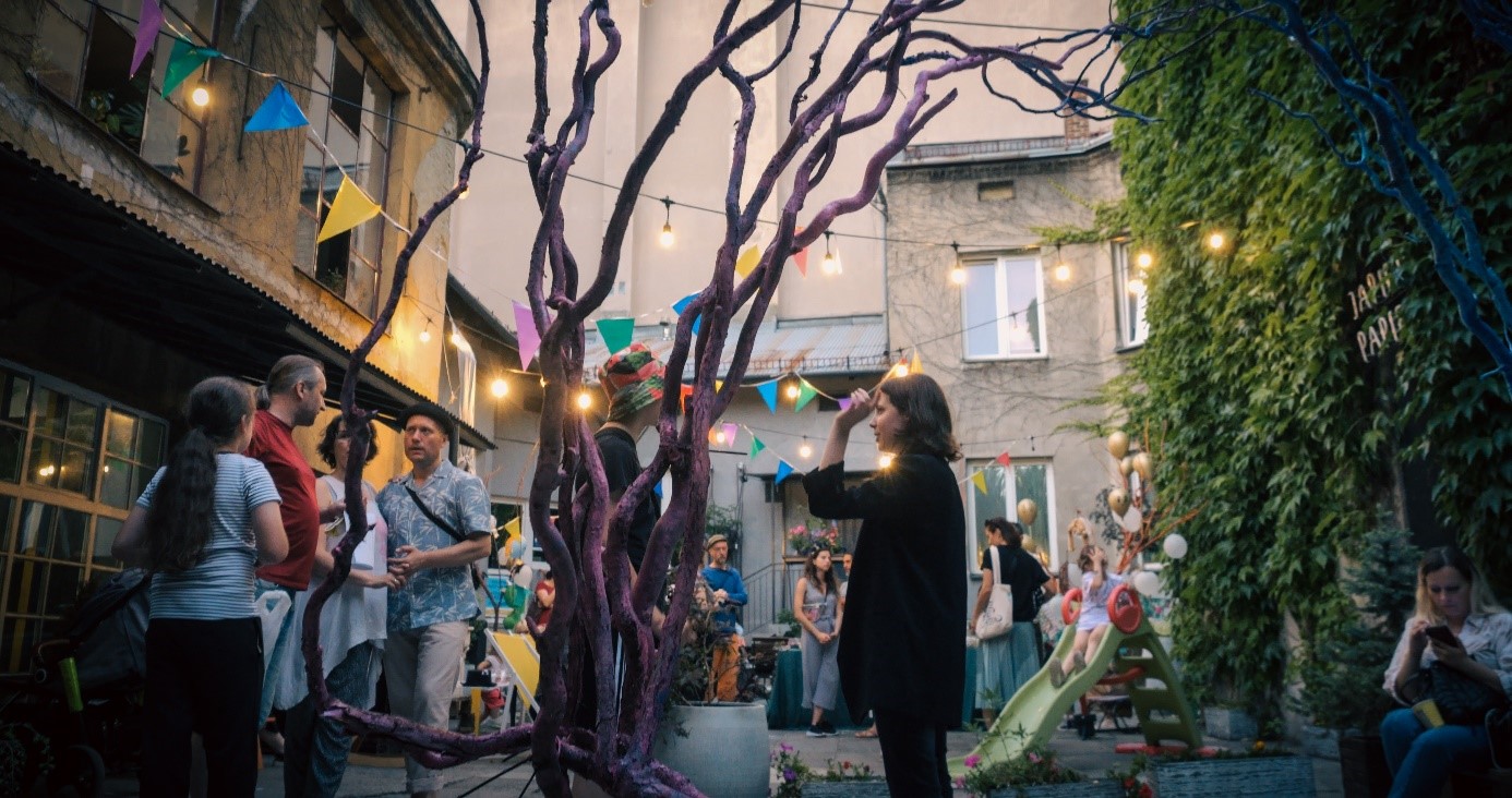 Półkolonie trwały, dzieci dostawały kolejne zadania. Poznawały dzielnicę, łączyły się w polsko/ukraińskie pary i zespoły, tworzyły grę miejską, kostiumy i happening dla sąsiadów. Chodziły do dzikiego parku w pobliżu i bujały się na drzewach. Wspólnie. Pod uważnym lecz dyskretnym okiem instruktorów.