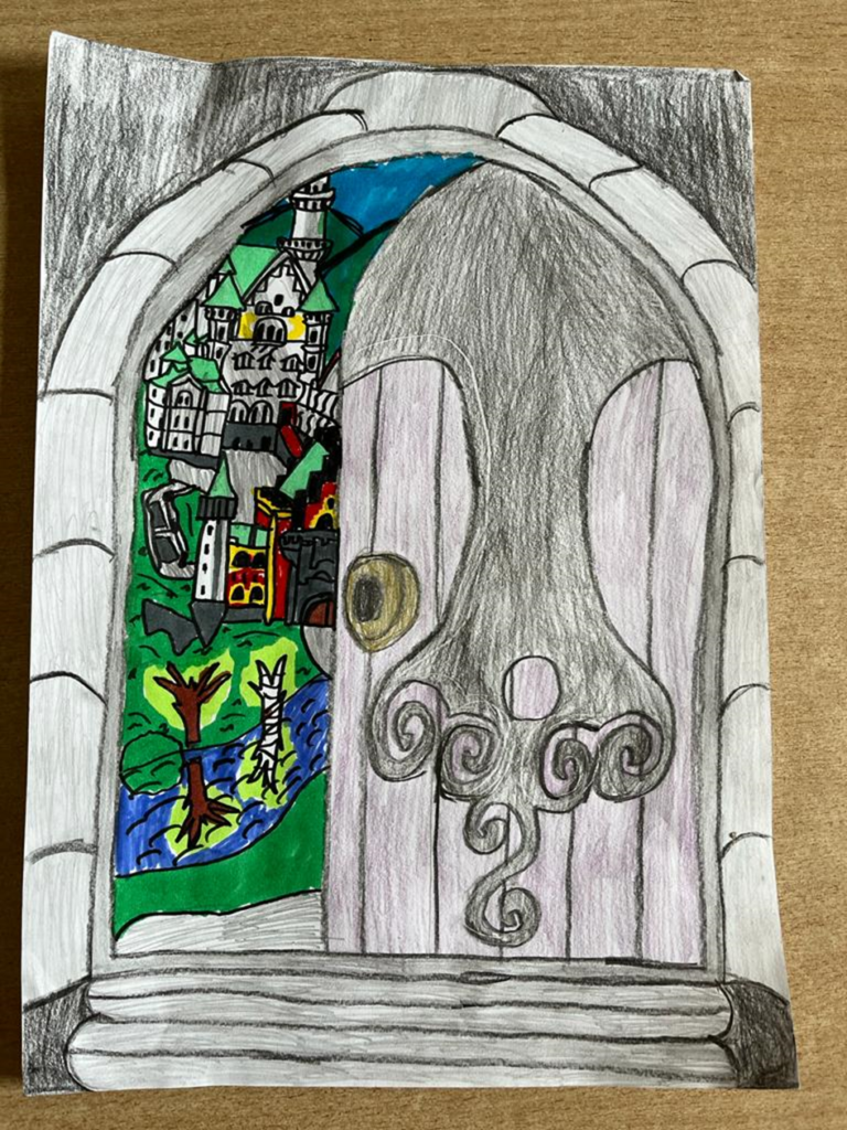 Po 10 dniach dzieci ponownie malowały to, o czym myślały. Sasza namalował obraz, który nazwał „Drzwi do świata wyobraźni”. Widzicie go poniżej. Za uchylonymi drzwiami widać bajkowy świat: błękitne niebo, wielki zamek na zielonych wzgórzach i rzekę, w której odbijają się rosnące nad nią drzewa. Wszystko jest kolorowe.