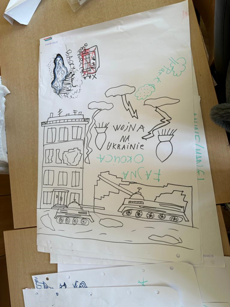 Tego dnia dzieci rysowały obrazki z własnej wyobraźni. Wszystkie polskie dzieci malowały kwiaty, motyle, góry i morze. Poniżej możecie zobaczyć rysunek Saszy. To czarno-biały obraz ze czołgami i napisem „wojna na Ukrainie”.